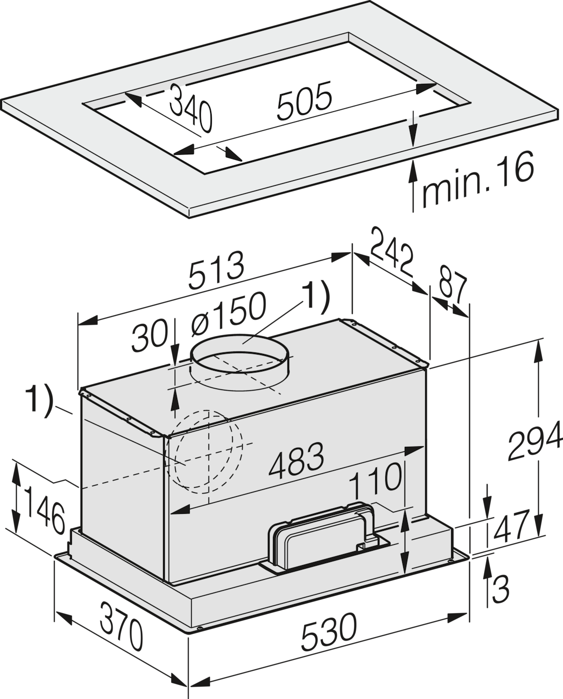 1) Exhaust air connection alternatively to the rear., Exhaust air connection Ø 150 mm., Further detailed dimensions can be found in the operating instructions!