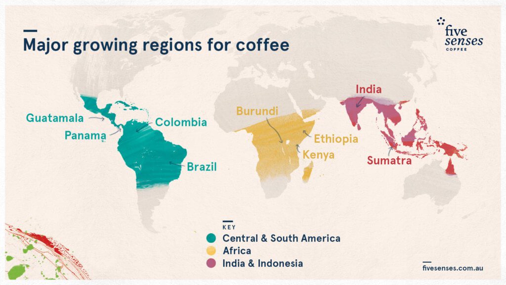 Growing conditions and economic factors vary greatly across the planet and so it’s no surprise that coffee grown in one country will be different from the next. Wine drinkers have a long-held appreciation for this phenomena, having come to expect to see specific flavour and aroma characteristics from a French wine that may be clearly distinctive from an Italian or something grown in Australia. Coffee prefers to grow in the warmer latitudes between the Tropic of Cancer and Tropic of Capricorn. This band of latitudes is often referred to as the ‘coffee belt’. Within this band a vast array of variables exist including altitude, rainfall, soil conditions and sunlight, all of which will alter the outcome of how your coffee will taste.