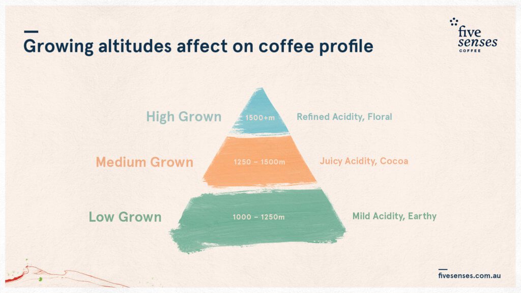So what numbers should I look for? Anything growing above 1500 masl (meters above sea level) is quite a high growing region, and will generally exhibit a refined sweetness and acidity (remember those tasty Kenyan coffees we talked about earlier?). While lower down at 1000masl – 1250masl the acidity is mellowed significantly and more earthy tones are found, think Brazil or India.