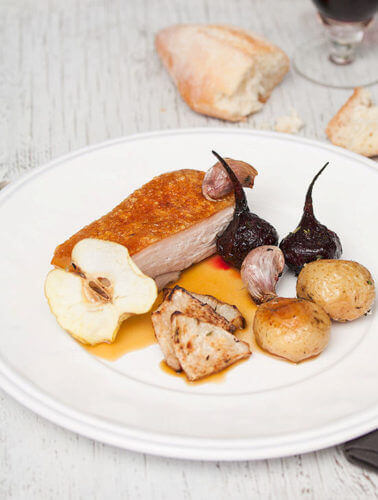 Second course and the main event – Roast Pork Belly with Vegetables and Apple Chips, another recipe courtesy of Shannon Bennett.
